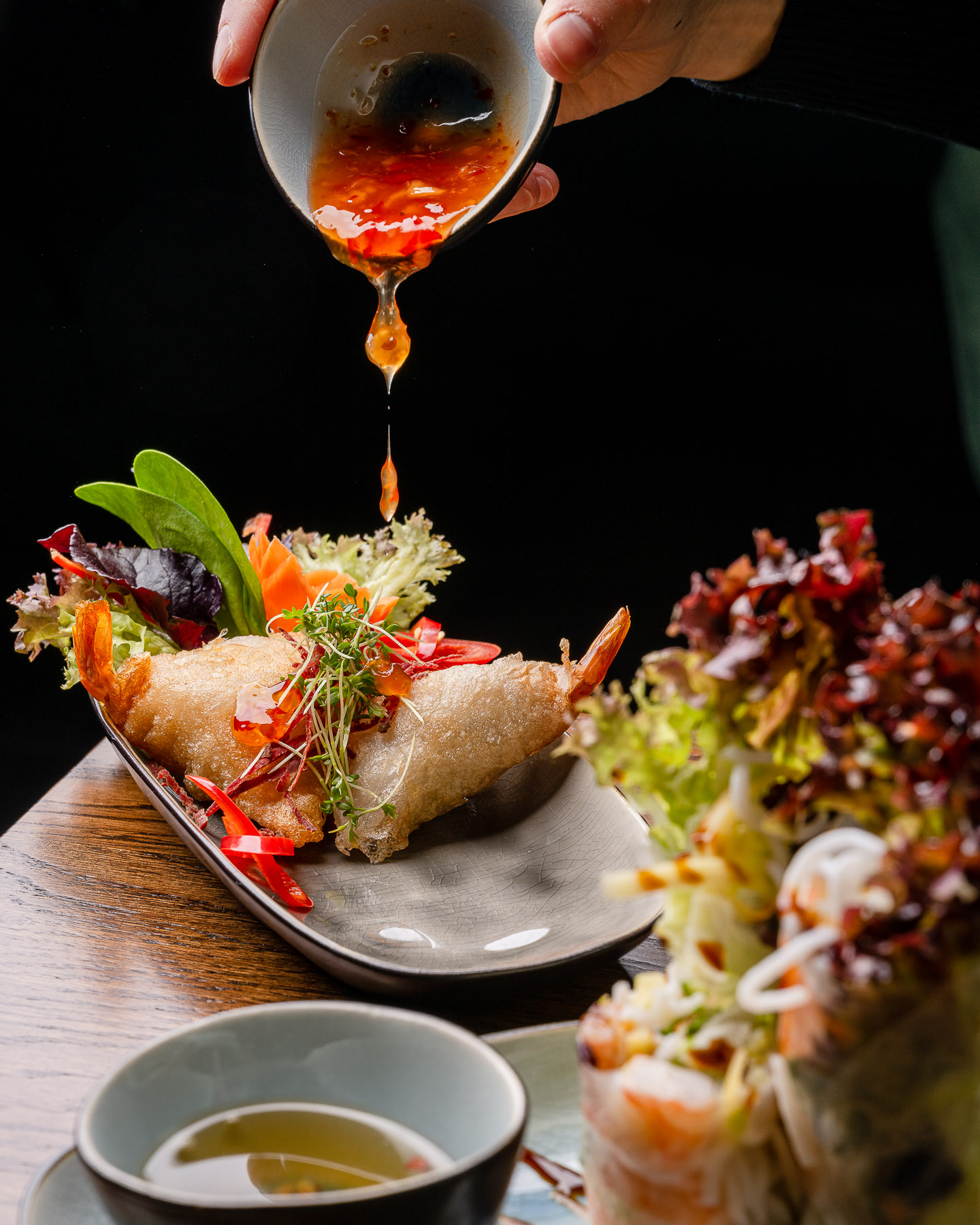 Frühlingsrollen mit gemüse, hähnchen, garnelen, serviert mit limetten-fischsoße