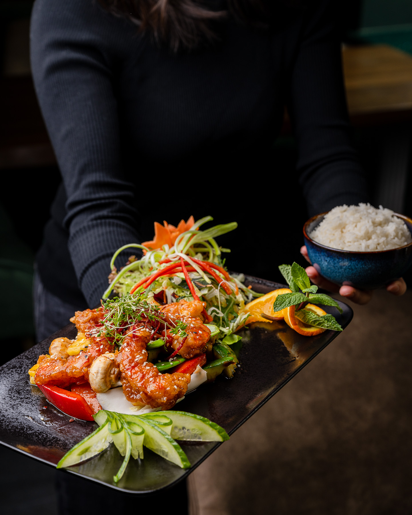 Wok geschwenkt mit zitronengras, gemüse, hoisin-soße, sambal olek, koriander, dazu beilage reis, wahlweise mit hähnchen