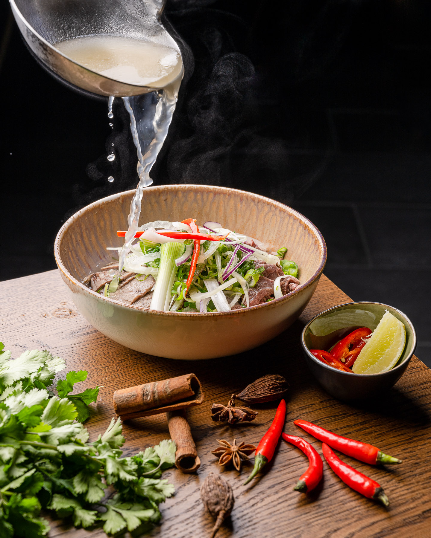 Traditionelle nudelsuppe mit süß-sauren aromen, zitronengras, kräutern und rindflei15.9sch