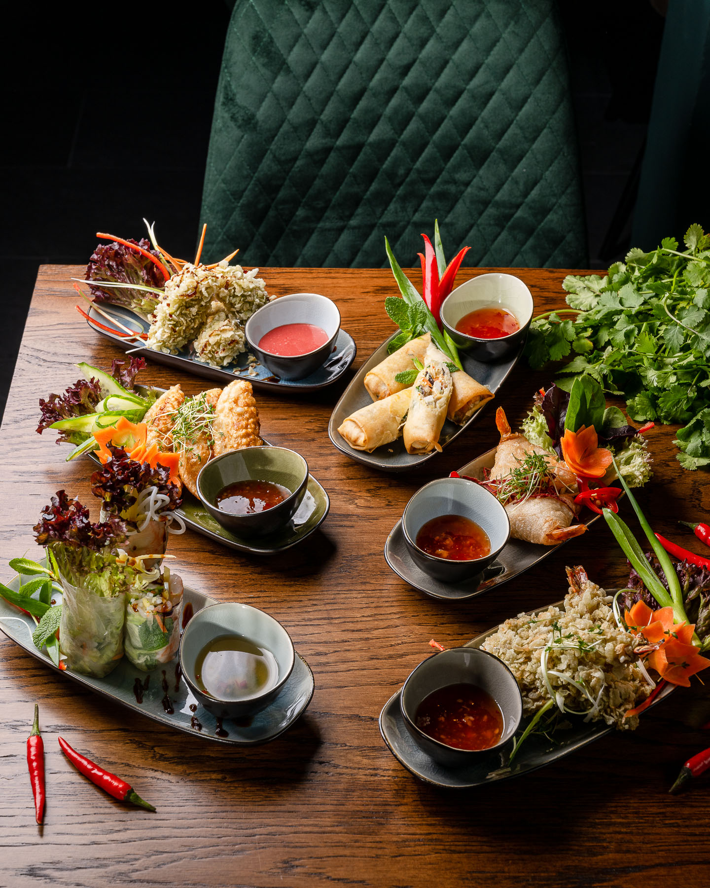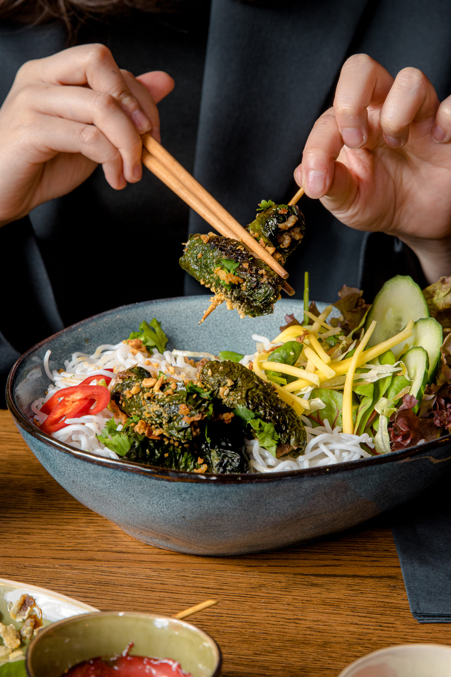 Sommerrollen mit reisnudeln, wildsalat und Koriander dazu erdnusssoße oder limetten-fischsoße wahlweise mit tofu