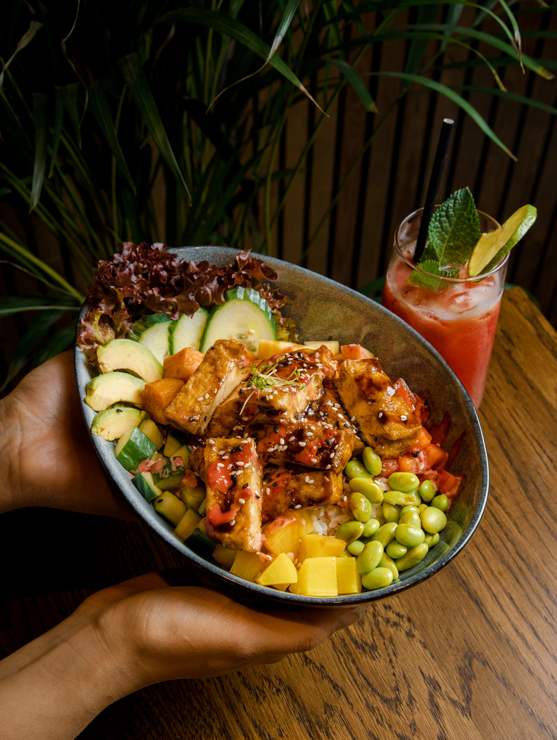 Mit avocadopüree, wasabi, kokosmilch und saisonalem gemüse