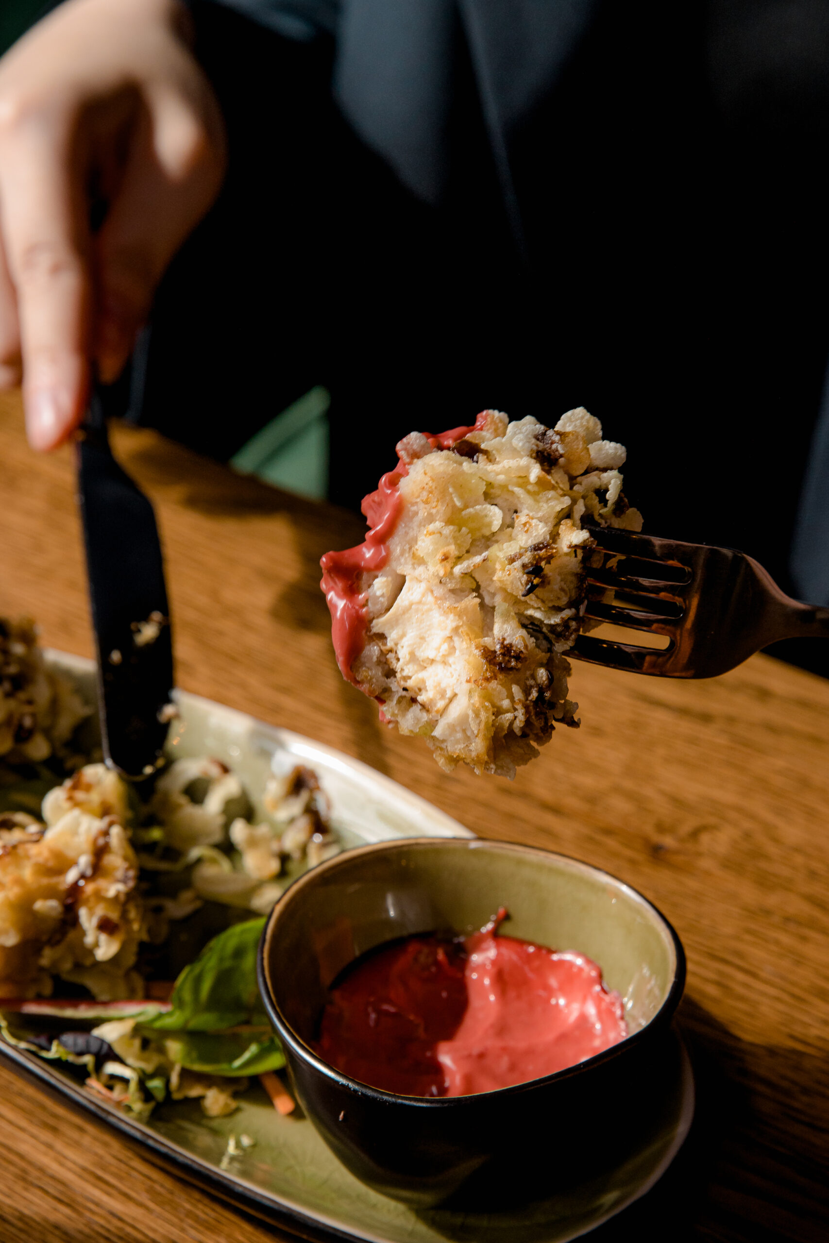Tofu mit reisflocken, mit himbeer-chili-dip